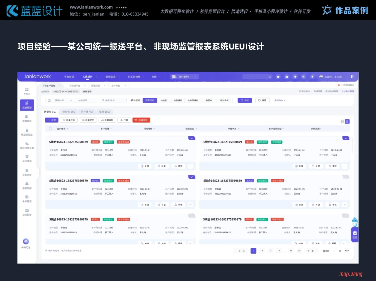 蓝蓝设计工作室2008年开始,2011年正式成立北京兰亭妙微科技有限公司,主创清华团队,专注软件和互联网ui设计开发,擅长企业信息化管理、监控、大数据软件UIUE咨询和设计开发服务。立足UI,一直在学习进步。金融行业UI设计过程中,兰亭妙微通过深入了解用户需求和行为,优化软件的操作流程和功能布局,不断优化界面视觉设计,采用简约、现代、科技感的设计风格,让用户感受到更加顺畅、高效、愉悦的软件使用体验;视觉语言传承和创新公司品牌的特色和风格,并形成UI规范-系统化的设计语言,兰亭妙微参与的重点软件项目有:人民银行征信系统、数据报送、反洗钱、1104、east、审计、财务资金等软件。