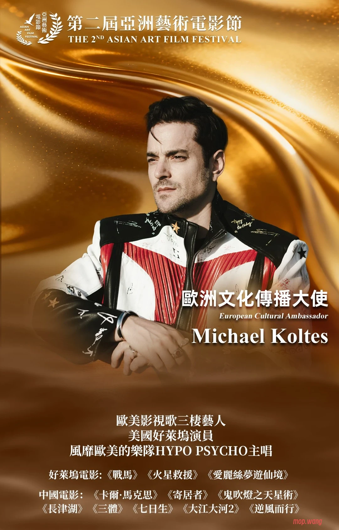 亞洲藝術電影節榮幸宣布: 歐洲文化傳播大使、歐美影視歌三棲藝人 Michael Koltes,正式出任本屆 亞洲藝術電影節傳播大使。 身兼美國好萊塢職業演員與歐美人氣樂隊 HYPO PSYCHO 主唱,Michael 以其跨文化背景與多領域創作能量,在全球藝文界擁有深遠影響力。他參演多部國際知名電影,包括: