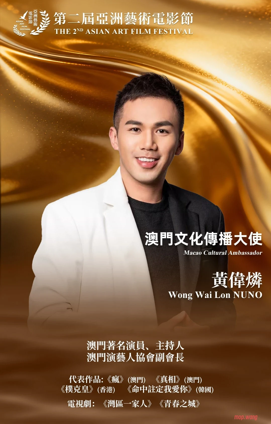 亞洲藝術電影節正式宣布邀請—— 澳門文化傳播大使、知名演員與主持人 黃偉燐(Wong Wai Lon NUNO),出任本屆 亞洲藝術電影節傳播大使。 作為澳門演藝人協會副會長,NUNO 長期深耕影視表演與文化推廣,憑藉扎實的專業能力與極具魅力的舞台形象,積極促進澳門與亞洲多元文化交流。