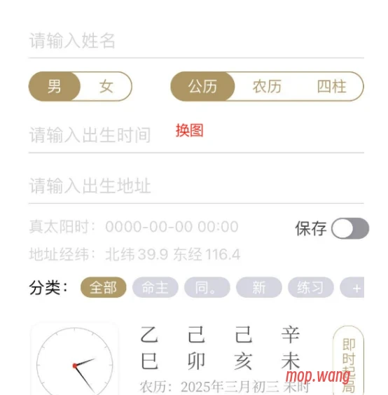 输入步骤: 选择性别 → 输入阳历/农历生日(支持真太阳时校正) → 调整出生地 → 生成排盘报告