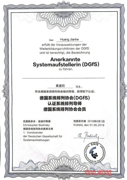 黄建和老师的努力和成就得到了广泛的认可和赞誉。他获得了德国系统排列协会(DGfS)认证系统排列导师的称号,成为了该协会的会员。这一荣誉不仅是对他专业能力的高度肯定,更是他在国际心理领域的一张闪亮名片。