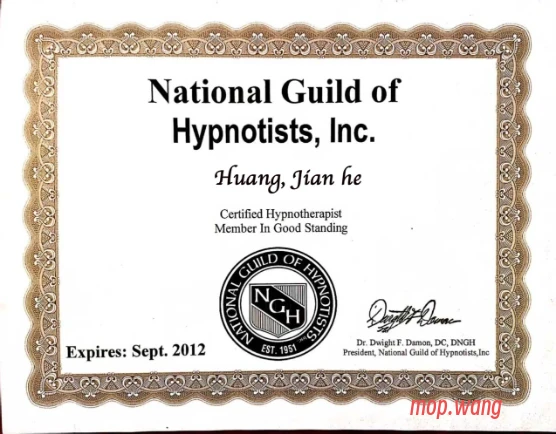此外,他还获得了美国国家催眠师协会(National Guild of Hypnotists, Inc.)认证的 Certified Hypnotherapist 资格,这进一步证明了他在催眠治疗领域的专业地位。
